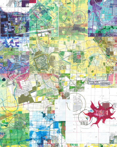 Gretzinger paints and collages pieces of the map based on randomly-generated instructions drawn from a special deck of instruction cards. When an instruction card is drawn, a modification is made to the specified panel, depending on what card and instruction is drawn. The original panel is scanned and filed, and a new panel takes its place. Rules could call for the addition of a new panel, new painting or collaging on an existing panel, the creation of a new facility or feature, or even the addition of a “void”-a white space removing what is underneath that can only be stopped by a defense wall card.