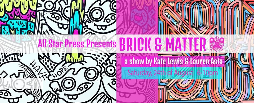 All Star Press is proud to present Brick and Matter, a dual artist show featuring Lauren Asta and Kate Lewis. We are excited to bring together two iconic women muralists and their graphic styles of mural work into the walls our gallery. As the digital age has altered the way we view and interact with art, murals have gained momentum in the way imagery can communicate with its surrounding environment. Both artists work to inspire ways of interaction and reflection as their murals on the outside walls of brick and mortar that hold a permanent, physical presence. This presence is expanded to viewers through their mesmerizing imagery, the art of physical production, and community conversation. Both Asta and Lewis’ artistic mural process works to inspire those to take a step back and celebrate the labor, love, and present moment of admiring art and the world around us that matters.