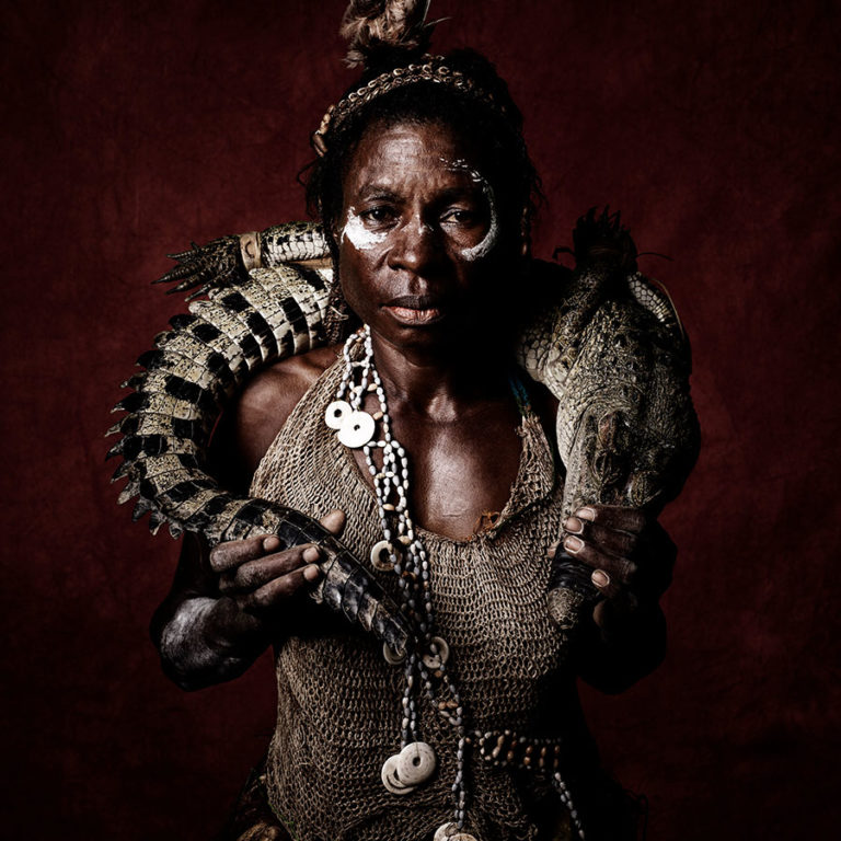Sandro made three trips to Papua New Guinea over a two-year period, photographing 400 indigenous people from more than a hundred different tribes, including the Geremiaka mudmen near Asaro, the Huli wigmen of Tari and in the Yenchan village tambaran (spirit house) by the Sepik River. Headdresses, face painting, tribal dress and ornamental talismans take center stage during the annual Sing-Sing festival, peaceful gatherings where tribes share their traditions through song, dress and dance. At the crocodile festival in the Sepik basin, tribes celebrate the special bond they have with the crocodile, which symbolizes power and manhood, by enduring skin-cutting initiations that resemble the back of the reptile. At these festivals, Sandro set up a studio, inviting hundreds of people to have their portraits taken. For most of the sitters, it was the first time they had ever seen a photograph or what they looked like. The result is a powerful body of work of a thriving culture far removed from its industrialized neighbors.