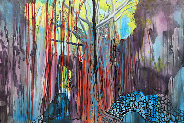 Event image: Laura Kina, “Ufushu Gajumaru (giant banyan tree), Valley of Gangala, Okinawa, Japan,” Acrylic on canvas, 48″x72”, 2019.