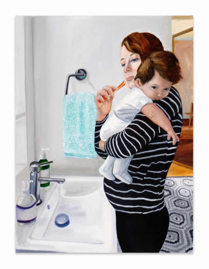After becoming a mother, my relationship to time changed and warped. I am awake more hours than I used to be and am busier than before. Yet, there is also a lot of downtime in my day when I am feeding or holding my sleepy daughter. It is during these times that I am alone with my thoughts. Those brief, flickering thoughts that come and go so quickly between so many other things have become the subject of my new work. Sam Anderson wrote, “How many fleeting associations combine to make up a life? How many rusty pipes do we mistake for owls? A vast majority of our waking hours are filled not with witty jokes or brilliant thoughts or epic feelings but with tiny, private mind-motions — thoughts that are hardly even thoughts at all, that don’t rise to the level of sharing with another human being. That millisecond when — again and again — a rusty pipe looks like an owl, or a newscaster’s voice reminds you of a long-gone uncle, or a daily routine sets off a small chain of involuntary associations. These things are almost nothing, and yet they are who we are.” These uncatchable, ghostly thoughts are almost impossible to notice and then adequately describe– a kind man who held the door for me and my bulky stroller; the perfect shadows of two curators on a wall; a rainy flight home; that gray lady on a smoke break, seen over a decade ago, blending in with three gray columns; startling myself awake from a nap because I thought I was falling. The act of painting these fleeting thoughts is an attempt to capture a nearly invisible but very large part of being alive.
