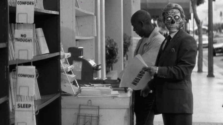 John Carpenter’s cult classic They Live is perhaps best known for its iconic line, “I have come here to chew bubblegum and kick ass. And I’m all out of bubblegum.” Following a drifter who discovers the world’s ruling class are aliens, Carpenter’s film presents a striking commentary on media manipulation, unchecked capitalism, commercialization, and the rising paranoia of middle Americans who increasingly distrust the global elite and political leaders of the world.