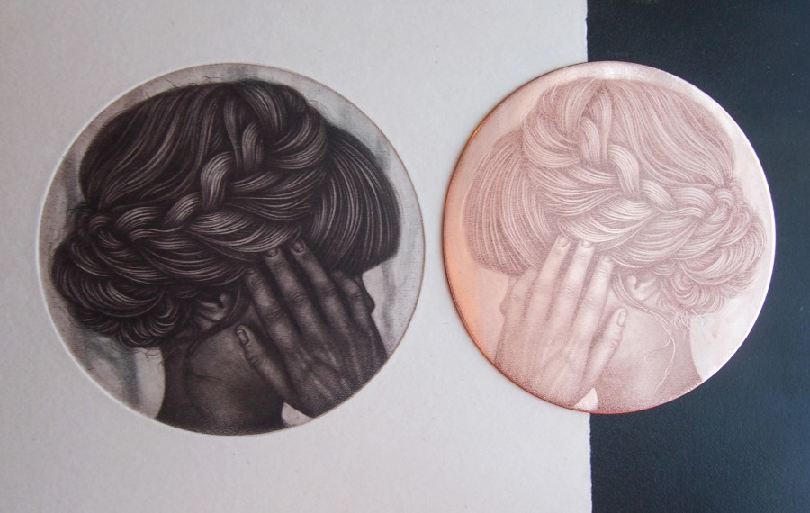 Gallery 2052 presents Plate, Pulp, Pressure, featuring the work of four contemporary printmakers: Michael Ezzell, Carrie Lingscheit, Hannah McMaster, and Ali Norman. The show opens January 30 and runs through March 7, 2020. This is the first exhibition at Gallery 2052 to showcase printmaking, exploring the overlap in detailed metal work made by intaglio printmakers, in addition to the gallery’s usual focus on jewelers. Intaglio prints are pulled from the surface of a metal plate on which the artist etches a design. For this exhibition, each artist’s prints are accompanied by their corresponding copper plates, and together, form a lush collection of intaglio techniques including mezzotint, water bite, chine-collé, aquatint, and hand-applied mixed media. Michael Ezzell reimagines ancient mythology on plates shaped like Greek vessels utilizing water bite and watercolor paint; Carrie Lingscheit renders soft, intimate vignettes through the high contrast of mezzotint; Hannah McMaster reshapes metal scraps into abstract compositions, punctuated by a variety of aquatint patterns; Ali Norman connects the natural and supernatural in highly detailed etchings with chine-collé. Exhibiting the matrix with its resulting print highlights the artist’s unique skill set, a topography on plate and paper not often revealed side by side.