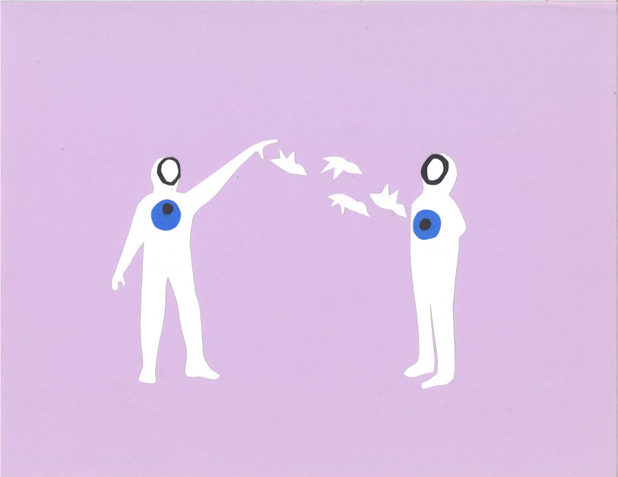In this exhibition, Nahmias continues to explore a project she began in the winter of 2017 where she stretched a tin can telephone in places where communication has been broken by geography, modernity, and politics. Over the past few years, the string has found its way over gaps and barriers such as the separation wall between Palestine and Israel, or peak to peak in Twin Peaks, San Francisco, CA. Bringing this project to an indoor space for the first time, Nahmias chose to create a multi tin can telephone installation accompanied by a book, The Orchestra Of Space Holders, to serve as a guide through a distant yet intimate conversation. Each page is followed by creatures who carry the protective/evil eye on their chest and exist to help us ponder and perhaps understand the commonly used term “to hold space”.