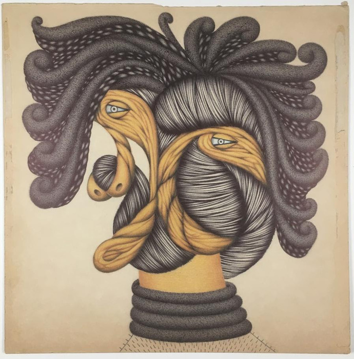The LP sleeves, the backs of which are so often the surface Pyle draws upon, are another holdover from his music career. Compared to the glossy print of the album covers, the versos are a kind of blank canvas, though in Pyle’s hands, even this plain paper board incites his aesthetic decisions. For the artist, the matte, lightly sealed surface is ideal for retaining the strokes of the pen; the square format and the head and shoulders of his subjects are in perfect harmony. In The Nice, Pyle makes use of an album cover entirely unfolded, its center crease a crucial component of the picture –a formal hinge separating the figure’s head from her body like an exquisite corpse. So too do the creases, tears and stains lend a patina that evidences the LP