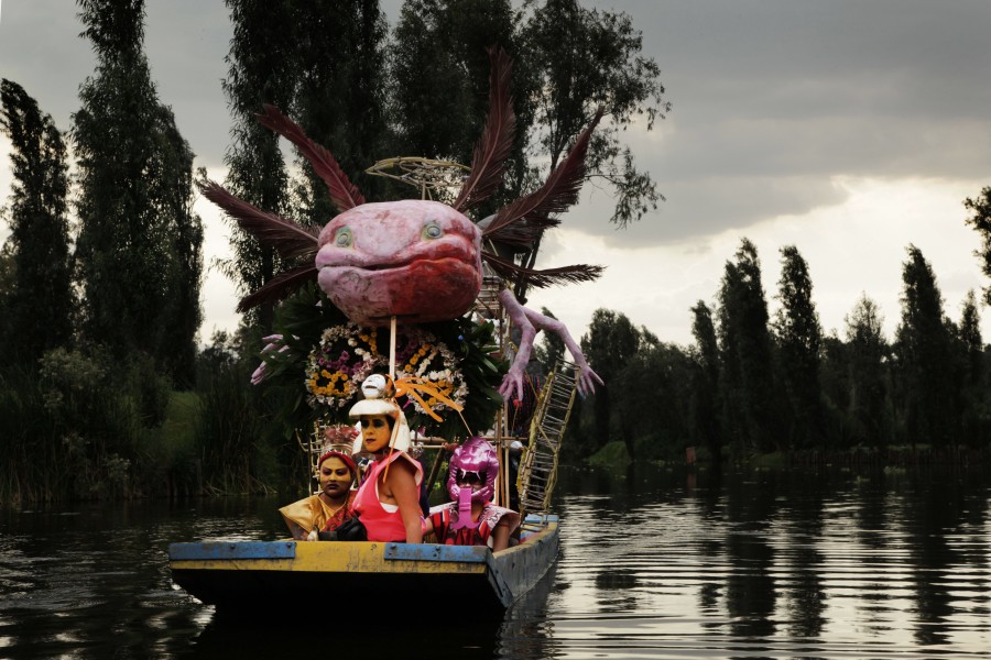 A cycle of psychedelic songs and videos imagines martyred Mixtec activist Bety Cariño on a journey through the underworld where she encounters women warriors, witches, widows, the dual-gendered goddess of death, and animals that are all preparing her rebirth party. The music is performed live with ornate props and costumes that echo Mexican B-side Sci-Fi films of the 60s and 70s, addressing indigenous women’s struggles and dispossession of their bodies, cultures, and territories. An axolotl, or Mexican salamander, preserved in formaldehyde is the storyteller, with sounds and voices from the past meandering throughout the songs.
