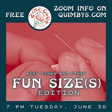 When many folks think of zines, they conjure up the classic image of sheets of copy paper folded in half and stapled down the center. But there are so many more ways to fold, cut, assemble, and bind a zine! This month at Zine Club Chicago Online: Fun Size(s) Edition, we’ll be discussing self-published works that come in non-standard sizes and shapes, from mini zines and accordion-style booklets to one-of-a-kind configurations. Grab your favorite titles, BYOS(nacks), and join us on Zoom for a fun conversation!
