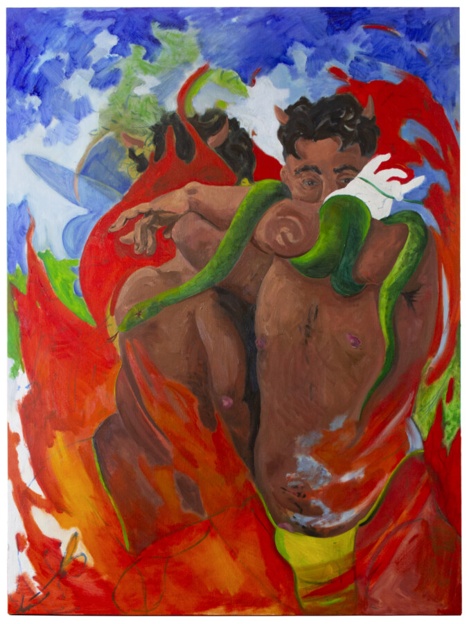 The body of work is attributed to Carol Ockman’s 1995 text “Ingres’s Eroticized Bodies” as a means of synthesizing layers of symbols and inspiration into paintings. “Using the serpentine line, Ingres shifted the representation of the heroic male in art to the homoerotic sensualized male nude, therefore creating an ‘other’ in gendered visual language,” says Partida.