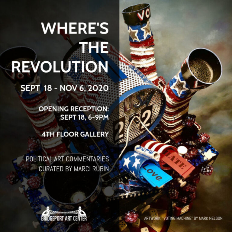 Where’s the Revolution, is an exhibition featuring political art commentaries curated by Marci Rubin. The role of a political artist is to express different points of view regarding global politics and social justice standards. Throughout history, artists’ works have documented and reflected the signs of the times. Examples of original political artworks in the exhibition include: commentaries on the political global climate in our past, present or future; peaceful protest banners & demonstration art; portraits of activists & key figures involved in government & social change; propaganda & satire cartoons; dedications & depictions of social movements. Paintings, drawings, graphic art, photography, video, and sculpture will be showcased in Where’s The Revolution