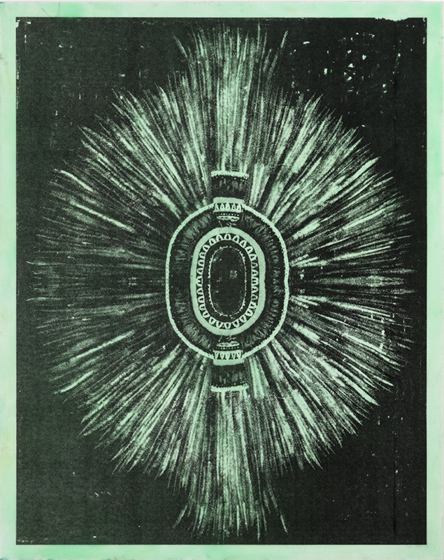 Salinas reconceptualizes images of the Penacho de Moctezuma, a headdress that most likely belonged to Moctezuma II, the ninth ruler of the Aztec empire from 1502 to 1520. It is one of the few surviving relics of its kind, made of 500 tail plumes of quetzals, a bird typical to the regions of southern Mexico and Guatemala. This object was a gift from Moctezuma II to the Spanish conquistador Hernán Cortés, and in the late nineteenth century it was acquired by the Austrian geologist and explorer Ferdinand von Hochstetter. The original quetzal headdress is now housed in the collection of the Museum of Ethnology in Vienna and has become a cultural icon of Austria.