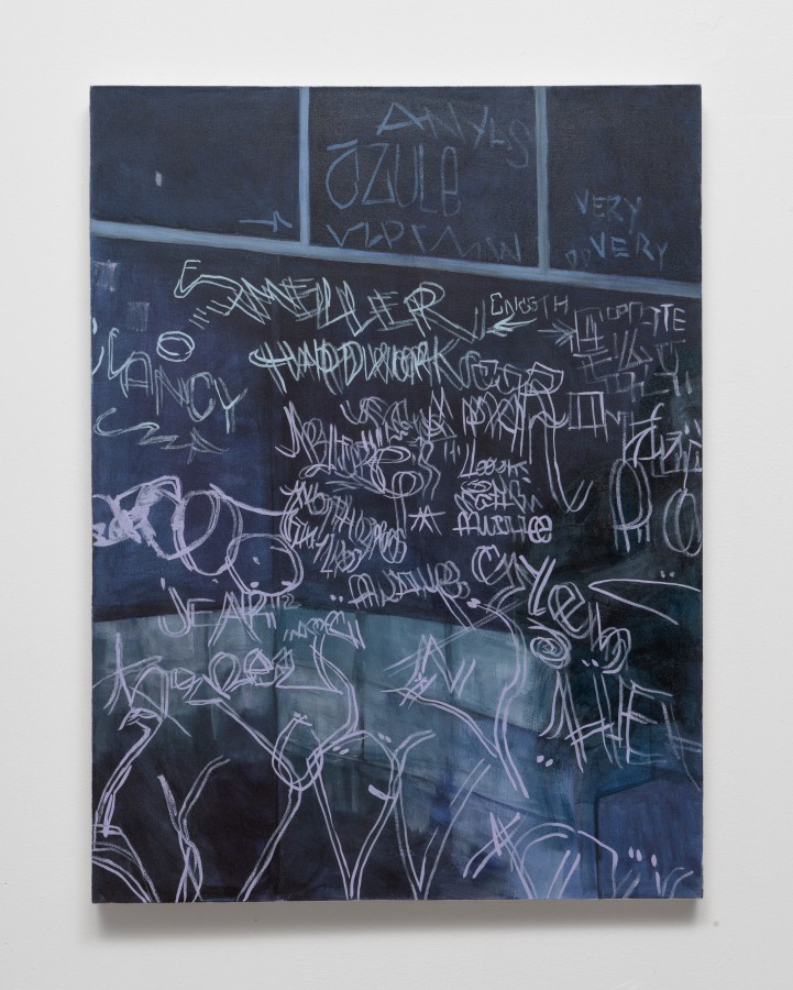 Her paintings skillfully capture scratched mirrored surfaces. Glyphs and graffiti, one liners and self-affirmations such as, “I WAS HERE” are immortalized across mirrors in unoccupied rooms. It is nearly impossible to ignore connections to a cinematic history of protagonists hiding behind or appearing in mirrors. Douglas Sirk’s All That Heaven Allows, Written on the Wind, as well as Rainer Fassbinder’s and Alfred Hitchcock’s films, come to mind. Not quite a house of mirrors, rather a fragment of a current individualistic culture, never ending Zoom meetings, interiors, and selfies reflecting and doubling upon themselves. These artworks are rooted in delicate tactile surfaces, fragility, and celebrate vulnerability.