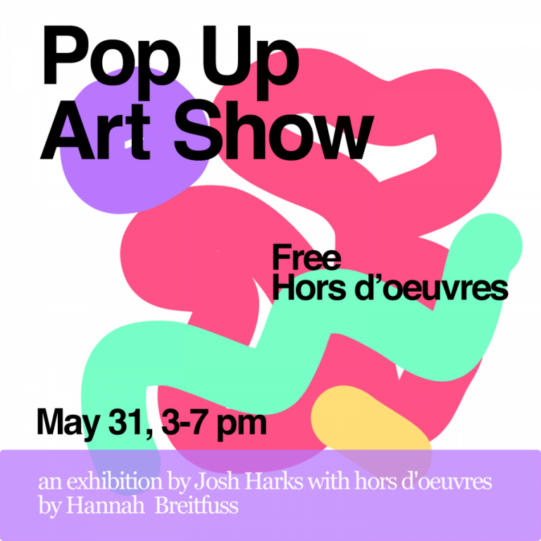 Looking for something to do on Memorial Day? Stop by our pop up show by Josh Harks and Hannah Breitfuss on Monday, 5/31, from 3-7 pm. Harks’ exhibition explores lines, curves, shapes, and spaces that maintain an overall sense of balance and expose themselves through a vibrant color palette. Breitfuss will be presenting savory hors d’oeuvres that she has developed through her recent culinary project. You’ll definitely want to come through as well as invite a friend.