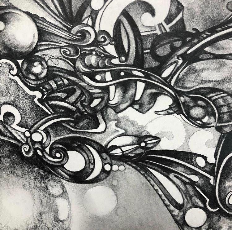 “In the uncertain, early days of COVID, I, like so many others, discovered that inspiration was very difficult to find. It was an unnerving time of unprecedented concern and shifting priorities for everyone. Early on I attempted but ultimately failed to find the motivation to return to the normalcy of working on my usual pencil drawings. Nevertheless, I still carted my sketchbook around with me and soon found myself getting lost in these small, fussy, ballpoint pen drawings. These spontaneous, non-objective doodles seemed to satisfy my desire to remain connected to the “art” side of me that just wants to make stuff, and at the same time proved to be strangely cathartic. These drawings were completely automatic, stream of consciousness-based therapy sessions.