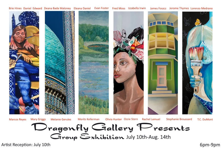 Dragonfly Gallery & Creative Spaces presents a group exhibition of over 15 artists. We will be showcasing painting, photography, mixed media, wood design, and sculpture. Artists in the show: Brie Hines, Daniel Edward, Deana Bada Maloney, Eleana Daniel, Evan Foster, Fred Moss, Izzabella Irwin, James Foszcz, Jerome Thymes, Lorenzo Medrano, Marcos Reyes, Mary Griggs, Melanie Gerules, Moritz Kellerman, Olivia Hunter, Ozzie Stern, Rachel Lemuel, Stephanie Broussard, and T.C. DuMont.