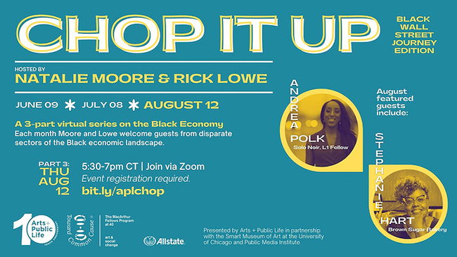 Join artist Rick Lowe and journalist Natalie Moore as they dish and dissect the intersections of race and economic development. Presented in conjunction with Lowe’s Black Wall Street Journey initiative, and anchored by the centennial anniversary of the 1921 Tulsa Race Massacre and observation of the historic Black Wall Street, this three-part conversation series touches on cultural dimensions of Black ownership, business, self-reliance, determination and mutual aid. This week’s CHOP IT UP featured guests include Andrea Polk (Solo Noir, L1 2020–2022 Creative Business Fellow) and Stephanie Hart (Brown Sugar Bakery). The Black Wall Street Journey edition of CHOP IT UP is presented by Arts + Public Lifein partnership with the Smart Museum of Art at the University of Chicago, in conjunction with Toward Common Cause: Art, Social Change, and the MacArthur Fellows Program at 40.