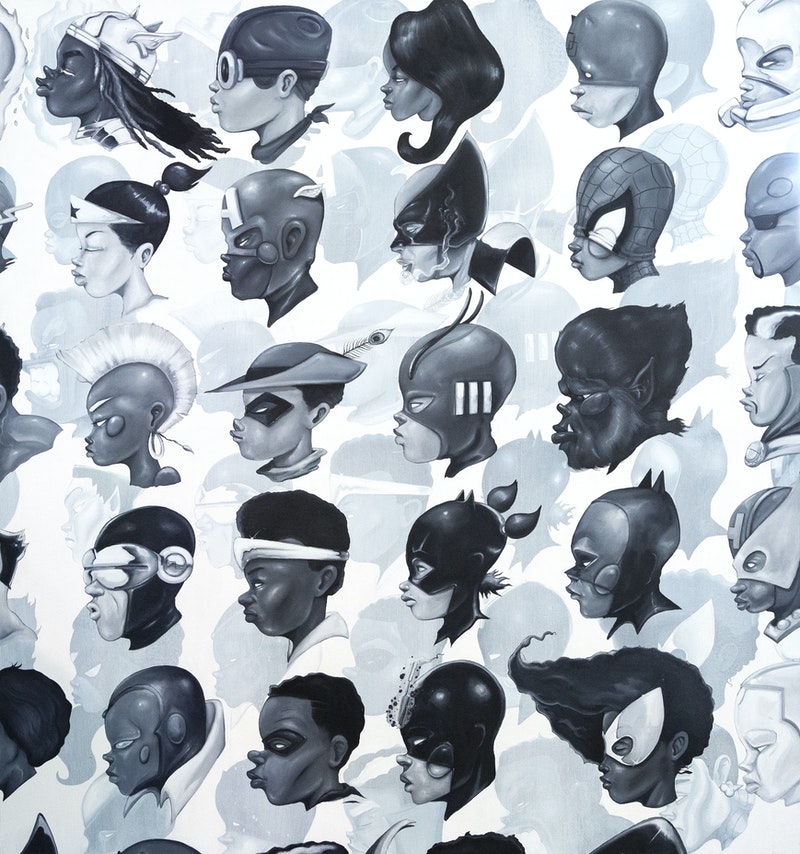 Hebru Brantley creates narrative-driven work revolving around conceptualized iconic characters, which he utilizes to address complex ideas around nostalgia, the mental psyche, power, and hope. Alongside these characters, Brantley uses vibrant color palettes and pop-art motifs to create a sense of accessibility for these layered and multifaceted ideas.
