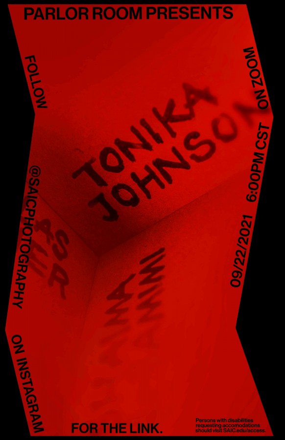 About this event Parlor Room is a visiting-artists program by Graduate Students in the School of the Art Institute’s Photography Department. We bring in creatives and scholars actively contributing to the photography field for our cohort, photo department, and greater SAIC and Chicago community. Join us Wednesday, September 22nd 6:00 pm online for the first public event of the 2021-2022 series. Parlor Room presents Tonika Johnson for a conversation surrounding socially engaged practices and critical dialogues between local communities here in Chicago.
