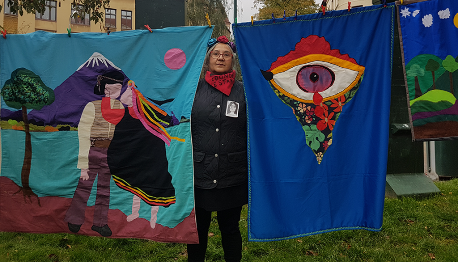 Bélgica Castro Fuentes started embroidering arpilleras in Santiago, Chile, in 1978 and was part of The Arpillera Workshop of The Association of Families of the Detained-Disappeared. She was invited to join this group because of her ongoing search for her husband, who was detained and disappeared forever by the military dictatorship of Augusto Pinochet on October 6, 1973. The group got together once a week to talk, embroider, and remember their loved ones who had disappeared. They made visual stories through fabrics and threads, leaving a testimony of what was happening, making their tragedy visible, and denouncing the atrocities that the civil-military dictatorship committed. The Vicariate of Solidarity would then sell these works abroad. Castro was then exiled to Sweden, where she has been living since 1986 and has developed an incredible body of work in the two cities where she has lived these last years, first Vaxjo and then in 2005 she moved to Malmö.