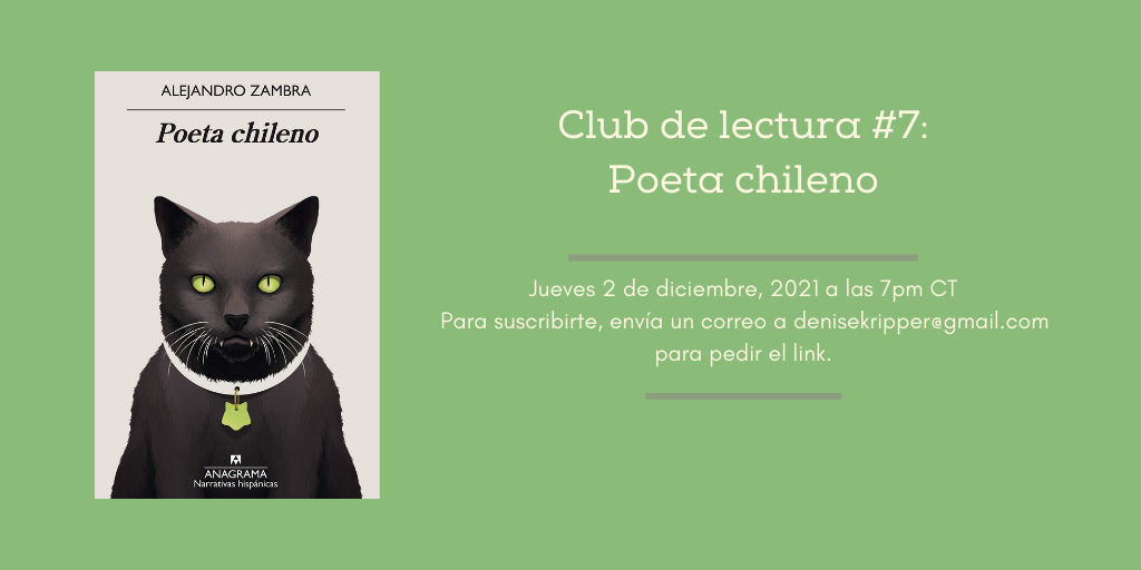 El Club de Lectura se centra en literatura latinoamericana contemporánea. Cada dos meses, leeremos ficción de distintos países hispanoparlantes del continente. La charla será en español también. En el próximo encuentro leeremos Poeta chileno, de Alejandro Zambra. Charlaremos del libro por Zoom el día jueves 2 de diciembre a las 7 pm CT.