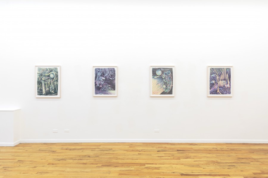 Megan Greene’s latest exhibition at Regards, Shrimp Eagle Owl, features a set of 11 new drawings that push her already highly explorative and technically disciplined approach into more vibrant and denser terrain. Compositional energies thrust vertically up and down, intersecting with horizontally segmented zones, defining and betraying notions of clear spatiality. Within any single drawing, there are multiple sites of layered transformations happening at different speeds and for seemingly different reasons. Colors and forms that feel simultaneously familiar and unknown are intensified to create continuums across works that are more pronounced than in previous series. Wispy plants, human fingers and ears, or orbs that seem both planetary and ocular pop up across drawings filled with less definable structures and shapes.