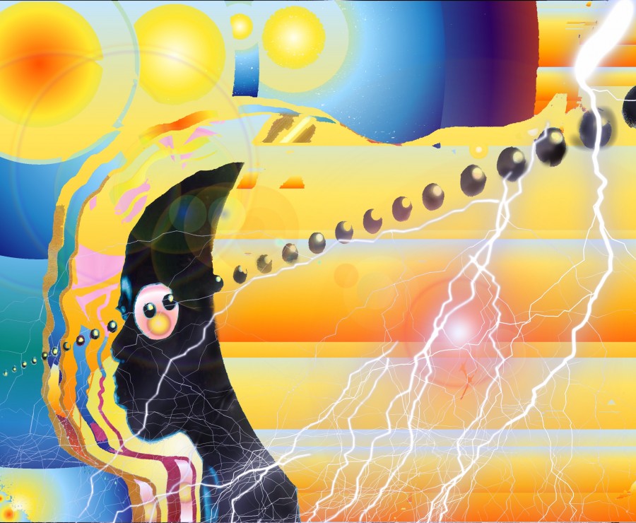 Olu’s art is termed “Retrofuturism,” which could be considered as a subgenre of Afrofuturism. Retrofuturism represents images from the ancient past, elsewhere in the present, and the future. This exhibit features Black Field and White Field art. Most of the Black Field is comprised of digital drawings/paintings/mixed media constructions on canvas, photo paper, or laminated prints. The White Field images are paint sharpies on canvas.