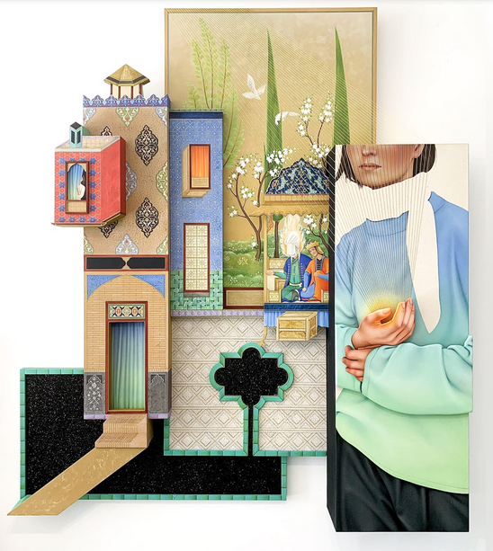 Khosravi’s paintings dazzle the eye with their dreamlike color palettes and masterful draughtsmanship. Yet, their most formidable visual characteristic is their multi-dimensionality. The images burst forth from the wall, their complex scaffolding of cut wooden panels offers a dramatic and constantly shifting perceptual experience to viewers. There are many hiding places in these painted realms, where danger lurks, and treasures await.