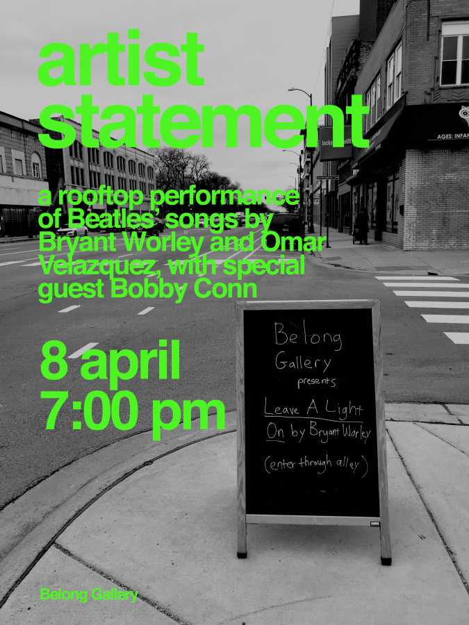 Come enjoy a rooftop performance of Beatles’ Songs by Artist Statement (Bryant Worley and Omar Velazquez), with special guest Bobby Conn. You will also have an opportunity to view our current exhibition, Leave A Light On, by Bryant Worley. The event is free and open to the public. (Enter through the alley behind Dollar General.)