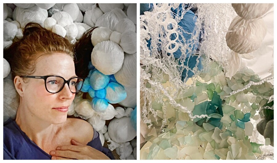 Jessica proves that trash is full of potential by creating colorful jewelry and sculpture using discarded items found during community clean-ups. This installation, inspired by sea life endangered by plastic pollution, is a continuation of that process. With Jessica’s cancer diagnosis in 2021, the work has expanded to also chronicle her experience with cancer – from diagnosis, through treatment and to recovery.