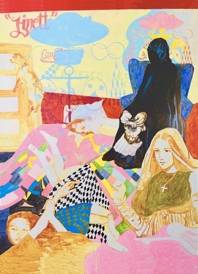 Multidisciplinary artist Ray Borchers has turned the key on Alice herself. With her signature delicate vows her work lives on a pendulum of minuscule detail and contrasted weighted forms. Her large format paintings are constructed through a collage-like process in sourcing images and in practice. Her subjects range from storybooks to lazed female forms; her dry humor and understanding of art ‘s greater life context is never far from her finished works. With a strong exhibition history she has refined and morphed her content and technique. She is also an avid clothing designer constructing original block prints for her co-label BOY NAMES, as well as a noise foundling in the band AITIS BAND. Ray’s committed practice has propelled her forth to constant new mediums to express her singular color vision of tension reimagined. She received her Bachelor of Fine Arts from the School of the Art Institute of Chicago.