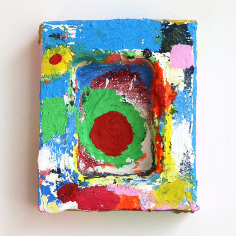 Roland Santana, an alchemist space maker building foundational structures where connectivity has a dance floor and portals open unto pathways of joy. Reaching for completion as it never comes, Santana’s work is always observing, catching a late night conversation or monitoring the DJ booth, all euphoric youthful interaction takes place inside of color and shape. Reducing lights to pattern and music to hue, the objects have made space for you to enter the circle and lose yourself in movement. Playing with time, Santana’s making depicts swift motions while simultaneously bearing the burden of concrete. Coating the unknown over and over to tell the story of today, the work holds its weight to stand it firmly in presence. Domestic building materials allow for familiarity as Santana makes them unrecognizable, distorting any possible past beginnings into a constantly evolving body. Please, follow the layers into Santana’s dimension of bliss and vibrancy where love is of highest value and support comes as a given. The limits are only the space itself while Santana depicts the inexorable and ever expanding joy.