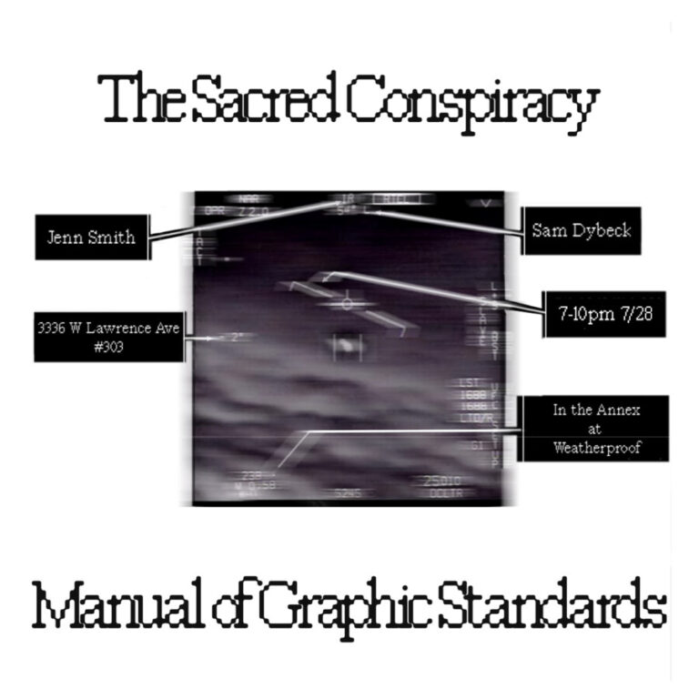 Weatherproof is proud to announce The Sacred Conspiracy Manual of Graphic Standards, an exhibition of works by Sam Dybeck and Jenn Smith. This will be Weatherproof’s first presentation of work at our new Albany Park space, The Annex.