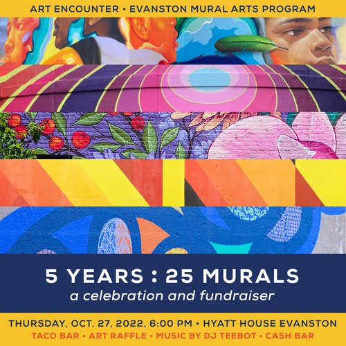 We launched our Evanston Mural Arts Program in 2017 with the goal of enriching the landscape of Evanston with bold, beautiful public art. This fall, we are thrilled to celebrate the program’s 5th anniversary and the completion of over 25 murals! Join us on Thursday, October 27 to toast this milestone, meet our incredible muralists and esteemed community partners, and help us bring even more murals to Evanston.
