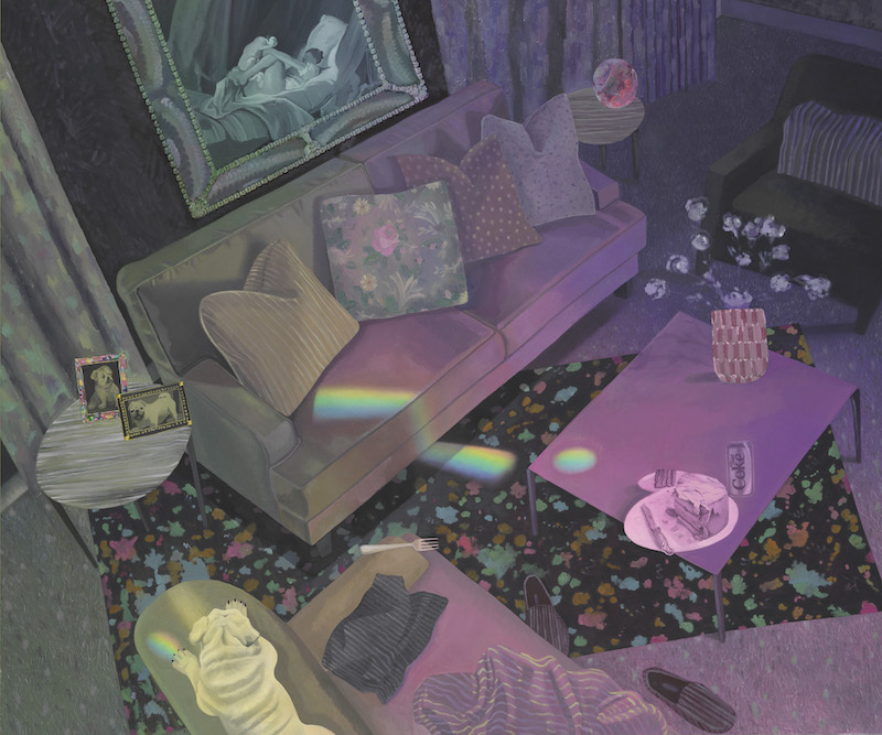 In the atmospheric paintings of Cindy Bernhard, we can see imaginary interiors with pop culture elements, food, and motifs from lifestyle blogs. In her works, she humorously critiques the nature of artifice and creates a vision of home as she wants to remember it. There are always pets, a small dog or cat, to add to the domesticity of the image.