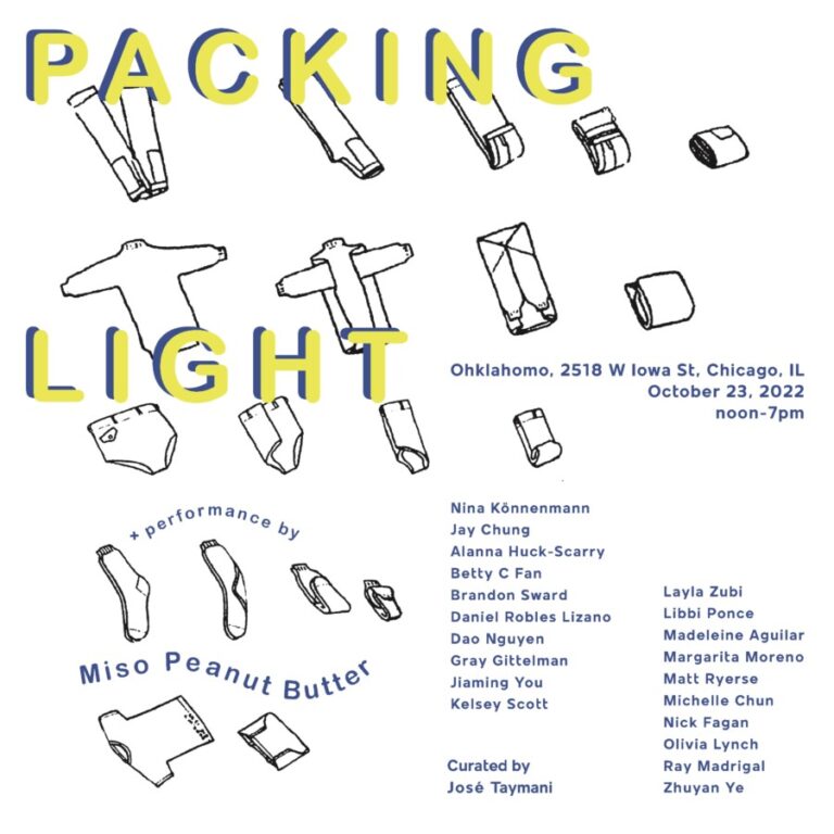 Tags: Alanna Huck-Scarry, Betty C Fan, Brandon Sward, Chicago, Daniel Robles Lizano, Dao Nguyen, Gray Gittelman, Jay Chung, Jiaming You, José Taymani, Kelsey Scott, Layla Zubi, Libbi Ponce, Madeleine Aguilar, Margarita Moreno, Matt Ryerse, Michelle Chun, Miso Peanut Butter, Nick Fagan, Nina Könnenmann, Ohklahomo, Olivia Lynch, Packing Light, pop up, Ray Madrigal, Ukrainian Village, West Town, Zhuyan Ye