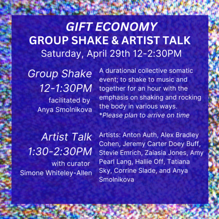 Stay afterwards for an artist talk and walkthrough of our current exhibition, “Gift Economy” with curator Simone Whiteley – Allen and artists Anton Auth, Alex Bradley Cohen, Jeremy Carter Doey Buff, Stevie Emrich, Zaiasia Jones, Amy Pearl Lang, Hallie Off, Tatiana Sky, Corrine Slade and Anya Smolnikova.