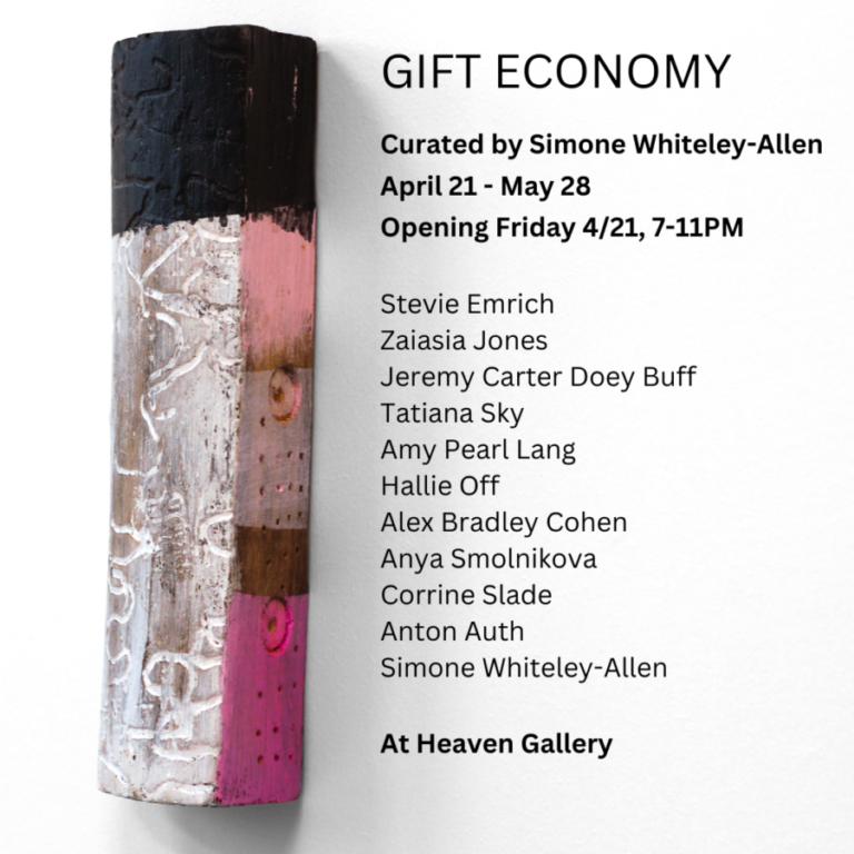 Gift Economy is a collection of works from painters, ceramicists, sculptors, and fiber artists. Curated by Simone Whiteley-Allen; Anton Auth, Alex Bradley Cohen, Jeremy Carter Doey Buff, Stevie Emrich, Zaiasia Jones, Amy Pearl Lang, Hallie Off, Tatiana Sky, Corrine Slade, and Anya Smolnikova are brought together by a shared investigation of their practices relation to performance art. Many of the pieces incorporate found objects and surfaces that are repurposed, emphasizing the journey of the material to the artist’s hand. Some of the works require activation by a natural element. All of the participating artists highlight intuition and improvisation in the process of creation.