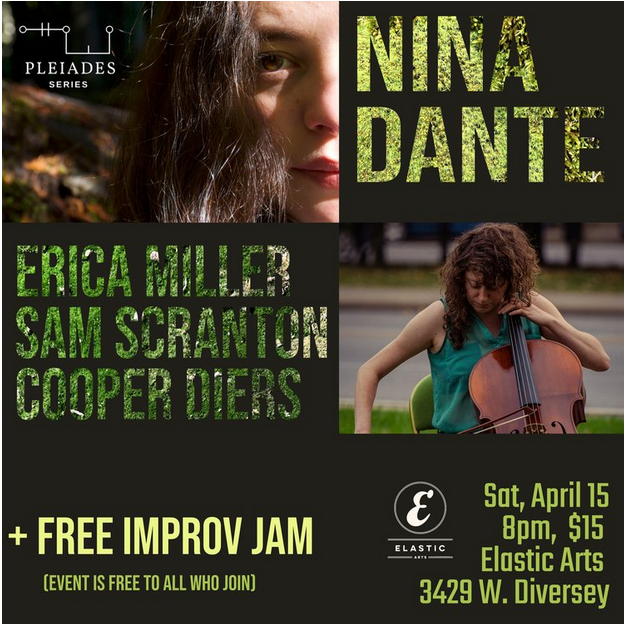 Pleiades is our monthly series that features womxn and non-binary musicians/improvisors and this month we’ll have two sets to open the night followed by an open jam! Starting the night out we’ll have a trio from Erica Miller, Sam Scranton, and Cooper Diers. We’ll then have a solo set from Nina Dante where she’ll be presenting a piece based around feild recordings from her current PNW home along with voice. If you’d like to participate in the open jam (any femme / non-binary folks), please email pleiades@elasticarts.org