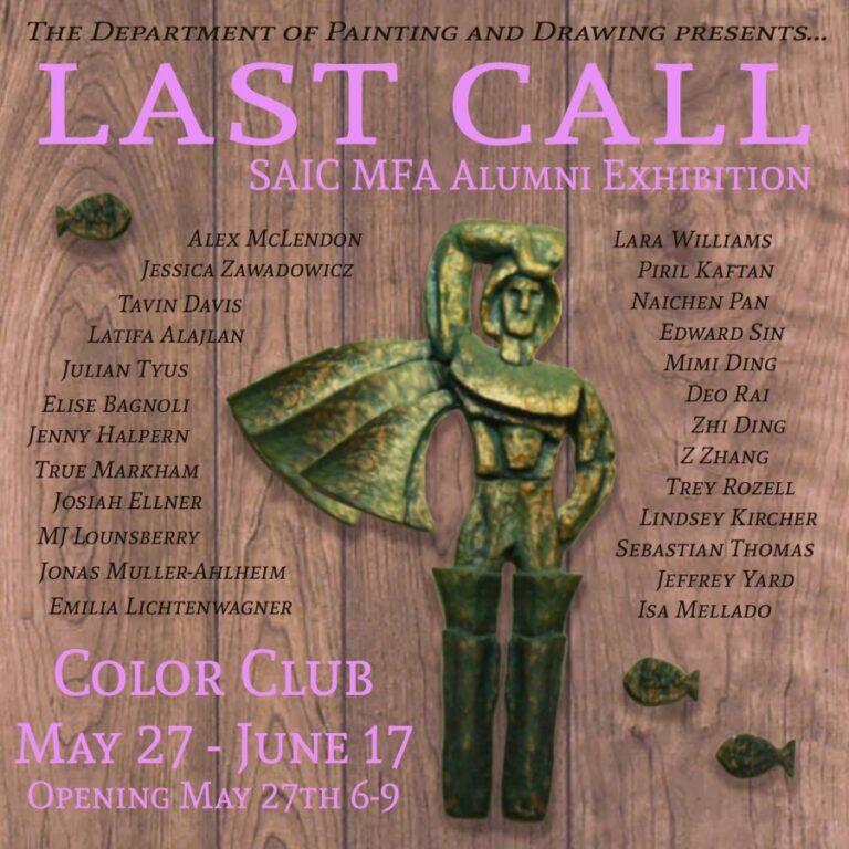 Tags: ALEX McLENDON, Chicago, Color Club, Deo Rai, Edward Sin, ELISE BAGNOLI, Emilia Lichtenwagner, Irving park, ISA MELLADO, Jeffrey Yard, Jenny Halpern, Jessica Zawadowicz, JONAS MULLER-AHLHEIM, joshdihle, Josiah Ellner, JULIAN TYUS, Lara Williams, Last Call: SAIC MFA ALUMNI EXHIBITION, LATIFA ALATIAN, Lindsey Kircher, MI LOUNSBERRY, Mimi Ding, Naichen Pan, Piril Kaftan, Sebastian Thomas, Tavin Davis, thesamjaffe, Trey Rozell, True Markham, Zhi Ding, ZZHANG