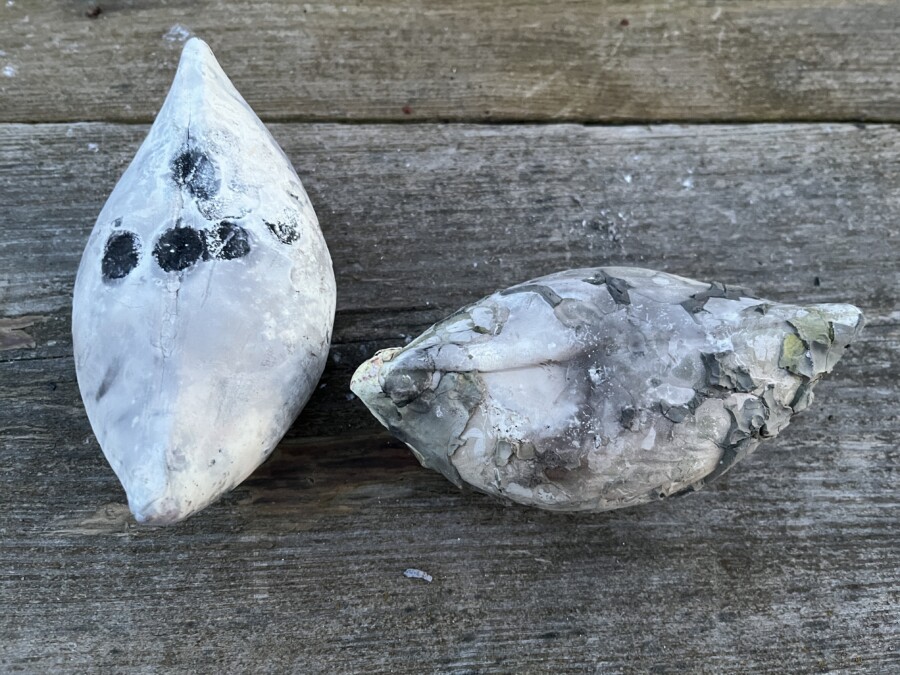 The drawings are recent; meditations on the sculptures, which are also quite recent. I set a regular/frequent, not-quite-yet-daily, practice of study, experiencing the three dimensions anew. The rubbings record my physical interaction with 300 year-old logs that form the house on my mother’s ancestral farm in Wisconsin. The sculptures are smoke-fired in small batches, fueled by materials gleaned from my collections – old newspapers, notes, and messages, seeds and branches. I conduct the firings in places meaningful to me and my family.