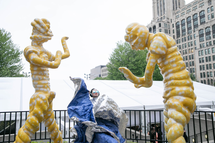 Blue Alice is a durational movement piece by dancer and choreographer Irene Hsaio. With a sculptural costume made of tarp and Mylar, Hsiao continuously shape-shifts throughout the performance. Often performed in gallery spaces, Hsiao crafts her performance in response to the artworks on view, often operating on a spectrum between human and object. Blue Alice’s expansive Mylar dress creates a sound similar to the ocean or a monsoon as it moves, drawing attention to the fragility of the materials, and the strenuous nature of durational work. Thinking of the costume as a shell, a shelter, or an armor though which viewers glimpse the shining creature hiding inside, Hsiao’s improvised performance plays with expected norms for how to interact with art and performance in a museum setting.