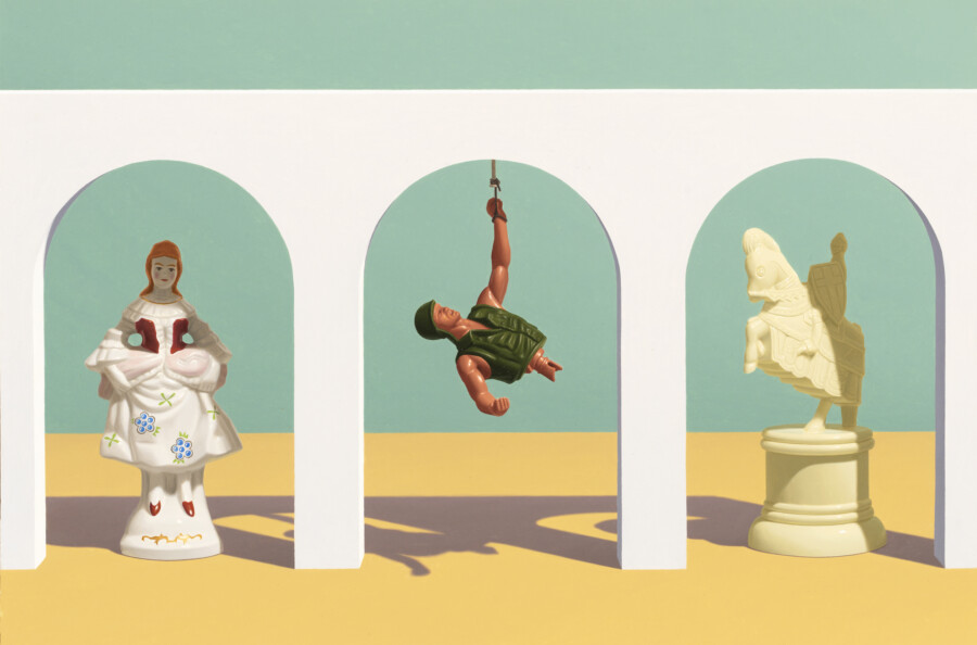 Cosnowski’s work is made for the keen art historical eye as well as the popular culture connoisseur; his paintings are filled with metaphorical easter eggs including influence from the formal expertise of Giorgio Morandi’s ceramic vessel paintings and the allegorical mastery of Giorgio de Chirico’s work. Cosnowski utilizes gradient pastel backgrounds and shiny objects such as trophies to illustrate the glossing-over of contradictions often hidden within systems that institutionalize behavior. Adhering tightly to his style of realism, he even paints his own reflection in the sheen of plastic gold trophies and other reflective objects, ultimately reminding the viewer of the artist’s hand in the work despite its photorealistic qualities.