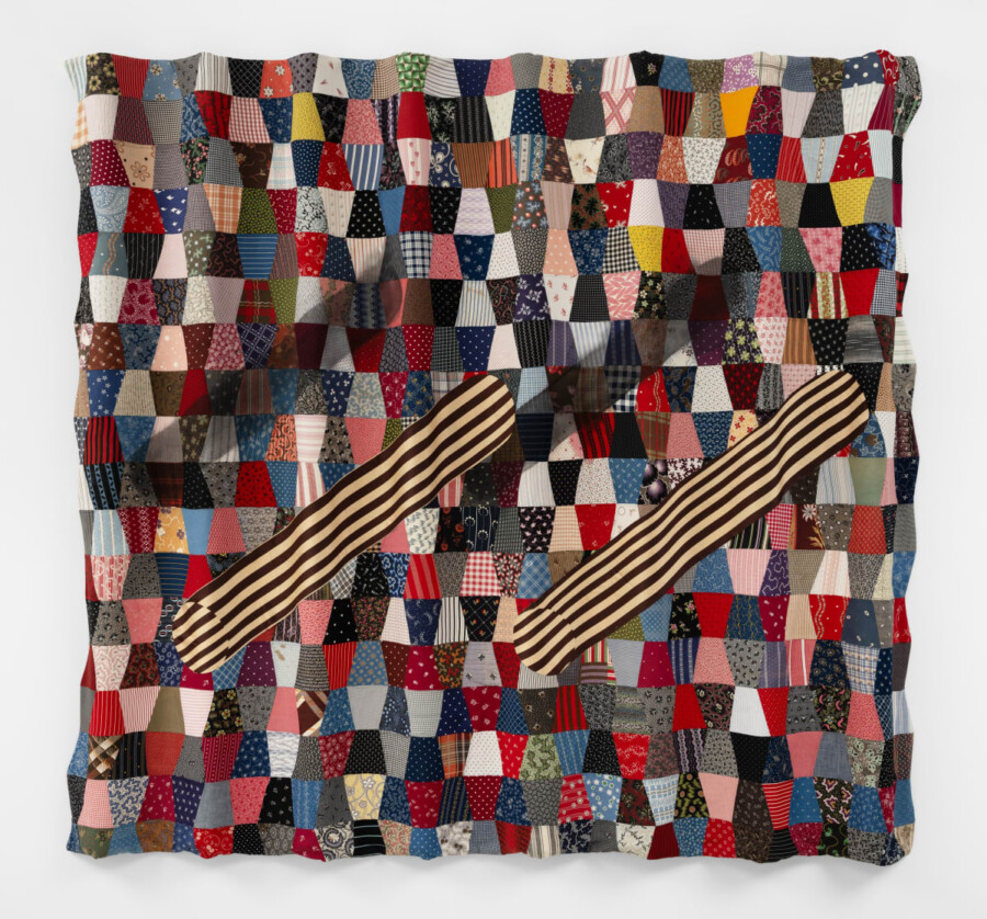 The marbles will be shown alongside a new work in his kaleidoscopic Codex series-a large-scale quiltwork composed from stitched geometric swatches stretched across a plywood armature to form a three-dimensional object that resembles folded paper. These origami-like quilts map a constellation of references from Japanese woodblock prints to Gee’s Bend quilts, from Duchamp ready-mades to signposts on the Underground Railroad. Having collected quilts over the course of many years, in this series Biggers’ aesthetic considerations of palette and pattern illuminate conceptual considerations of syncretism and appropriation.