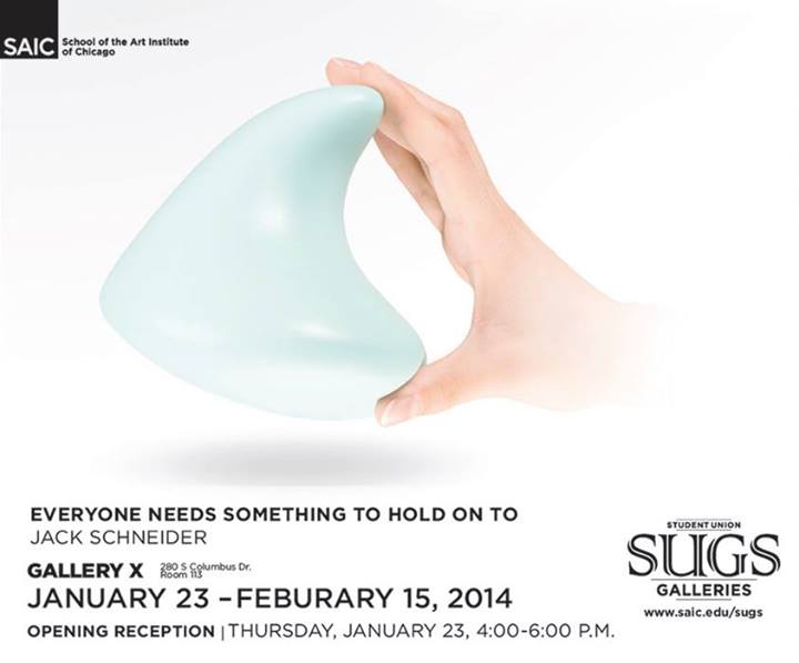 Everyone Needs Something To Hold On To presents a hybrid environment that blurs the line between art (original, singular) and design (commodity, multiple), retail space and the gallery. Sculptures by Jack Schneider (BFA 2014) draw from product design tropes, such as ergonomic impression and are presented alongside images that suggest a specific functionality while retaining an abstracted purpose.