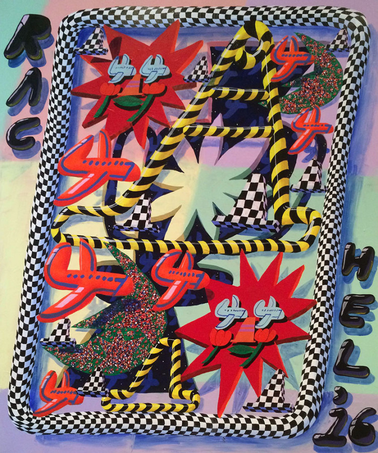Hayden creates monumental paintings whose garish colors and dizzying patterns are nonetheless grounded in a painstakingly consistent sense of logic. Systems emerge through repetition of what becomes a familiar cast of characters: a cartoon airplane, smiley-faced celestial bodies, a vessel, a potted plant, a traffic cone. When viewing a grouping of Hayden’s paintings, it becomes clear that these recurring pictographs, while perhaps cryptic, form a symbolic language unique to the artist’s practice. Through persistent repetition, the works communicate a yearning to decipher the monotony and beauty of daily life and the constant progression of time.