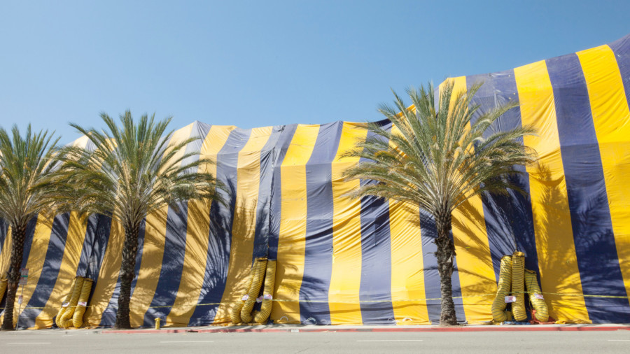 The point of departure Lisa Truttmann’s feature film Tarpaulins was a colorful disturbance on the cityscape of Los Angeles: a home in the distance festooned with a giant striped tarp. These are termite fumigation tents. The filmmaker follows their story on a two-year long investigation as she hunts down the tents, the homes, the termites inside and their traces. As the film goes on, the termites soon become our allies, guiding us through Los Angelesâ neighborhoods on their own terms. Questions of life and death, profit and loss, home and un-home, macrocosm and microcosm are brought to the fore in pursuit of the city’s tiniest inhabitants and their exterminators. The tents become temporary sculptures, beasts heaving in the wind, skeletons dressed and stripped by workers we see. Wooden structures, soon to be homes, become eroded landscapes after an attack. And there, underneath the colorful mantle and its function, Truttmann elicits revelations of the uncanny.