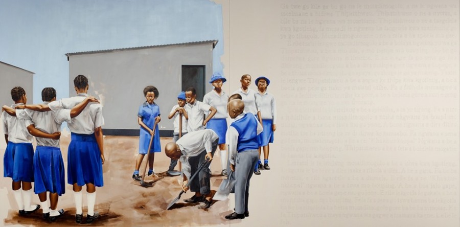 Mokgosi’s approach to storytelling through the form of history painting allows us to compare what we see in the paintings to the realities of inequality and gendered labor division we know from experience. This approach to the content also inspires us to think expansively about politics, power structures, and the role of history in the creation of the current nations of southern Africa.