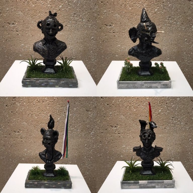 In this series, I used the same materials as found in Mexican cemeteries’ tombs: cans, plastic plants, marble, metal, and wood, combining religious figurines with popular culture and personal mementos. Tombs in this particular Mexican cemetery are ephemeral. People are only allowed to have their family members buried there for 10-20 years—renting the space until someone else uses it. These sacred places (carefully created by the deceased’s family) are eventually destroyed, making these memorials ephemeral, like our memories. Here, cymbals suspend, halo-like, above the pop-culture distorted heads of figures.