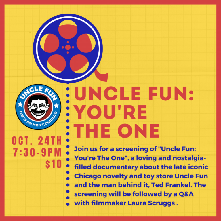 “Uncle Fun: You’re The One” is a loving and nostalgia-filled documentary about the late iconic Chicago novelty and toy store Uncle Fun and the man behind it, Ted Frankel. Made by first-time filmmaker Laura Scruggs (mostly with an iPad, partially with a Nikon camera), the film explores how the store began (as well as the store before it, Goodies); what the Uncle Fun store and Frankel have meant over the years to many devoted customers; Ted’s unexpected tragedy; the closing of the store; other fun stores around the country that Uncle Fun inspired; and Frankel’s current life as founder and operator of Sideshow, the gift shop at The American Visionary Art Museum in Baltimore. Uncle Fun is a story about being happy, being yourself, following your heart, and having hope.