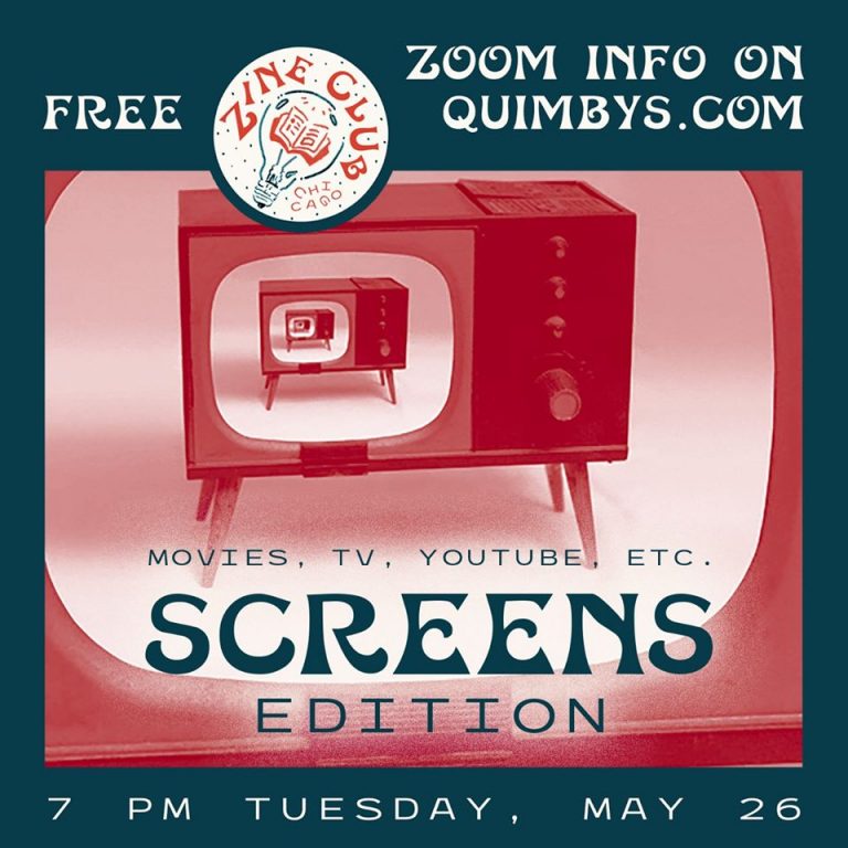 Movies, television shows, YouTube videos, Instagram Live, and oh so many Zoom events … we all like to watch, and we’ve all been looking at screens a lot more than usual since the coronavirus crisis began. We miss seeing your faces and sharing the zines we love, so in May we’re taking Zine Club Chicago ONLINE!