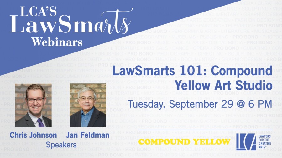 Lawyers for the Creative Arts (LCA) has been in business for 48 years to provide legal representation and educational programs for the arts community. In partnership with Compound Yellow, LCA is presenting an informational session, ”LawSmarts 101.” We’ll discuss common copyright issues faced by artists, fill you in on ways LCA can help you with business and legal issues that affect your work, and host a Q&A session during which you can “Ask a Lawyer Anything.”